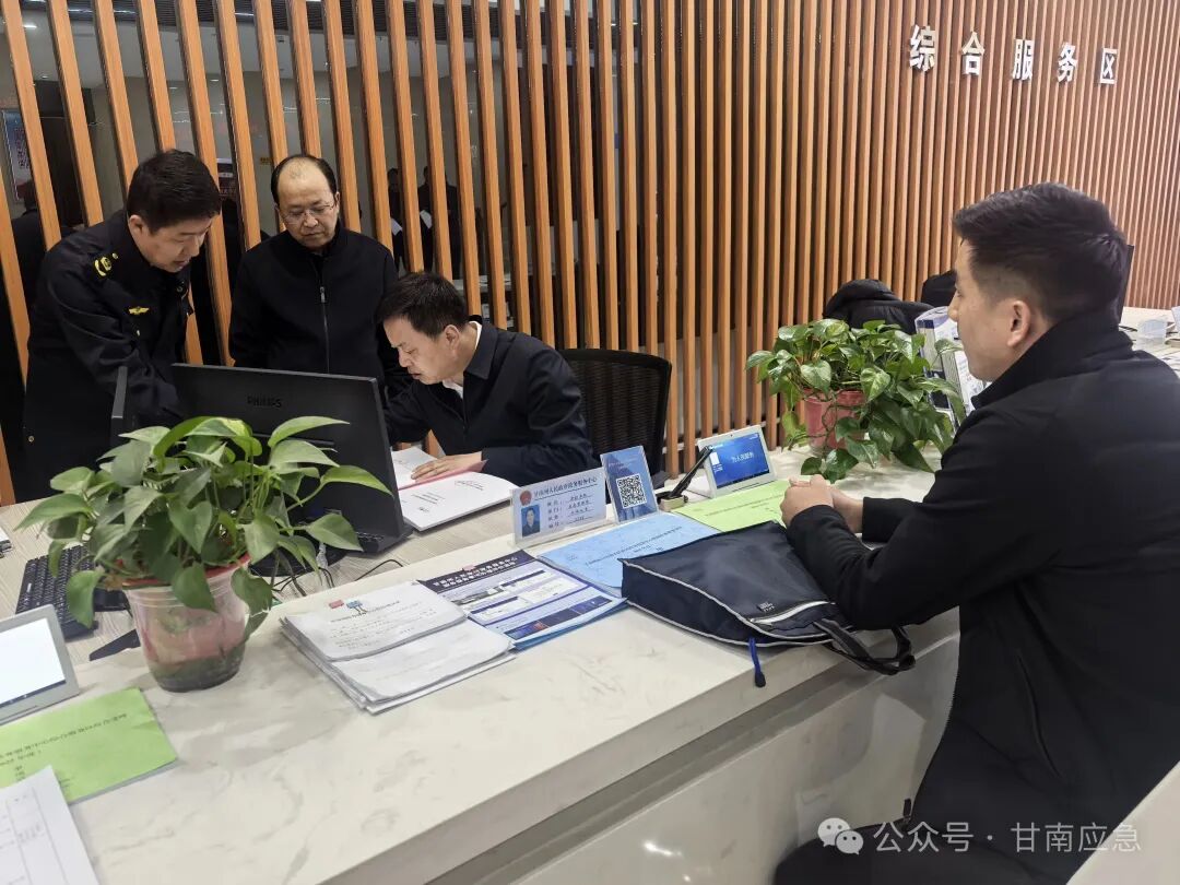 尤文平局长以窗口工作人员的身份受理了甘南州和田石油销售有限公司夏河县甘加加油站《危险化学品经营许可证》的延期事项,对企业提交的申办材料进行了细致审核,就申办业务过程是否流畅,是否需要多次重复提交资料,办事过程中是否有困难与企业办事人员深入沟通交流。随后,就危化品经营许可、安全管理证件核发、应急预案备案等高频事项办理规范、流转时限及网办实操要点,逐项体验、逐项问询、逐项把关,以审批人员视角,换位思考、换位办事,全流程面对面服务,促进审批服务优化流程、压缩时限、提高效率。