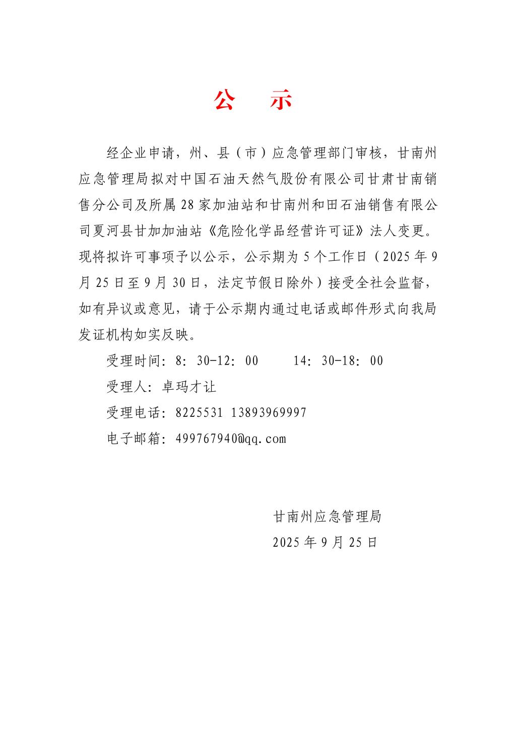 关于拟对中国石油天然气股份有限公司甘肃甘南销售分公司及所属28家加油站和甘南州和田石油销售有限公司夏河县甘加加油站《危险化学品经营许可证》法人变更的公示