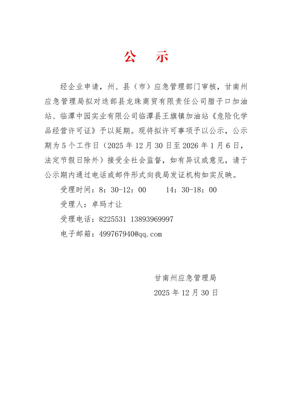 关于拟对迭部县龙珠商贸有限责任公司腊子口加油站、临潭中园实业有限公司临潭县王旗镇加油站《危险化学品经营许可证》予以延期的公示