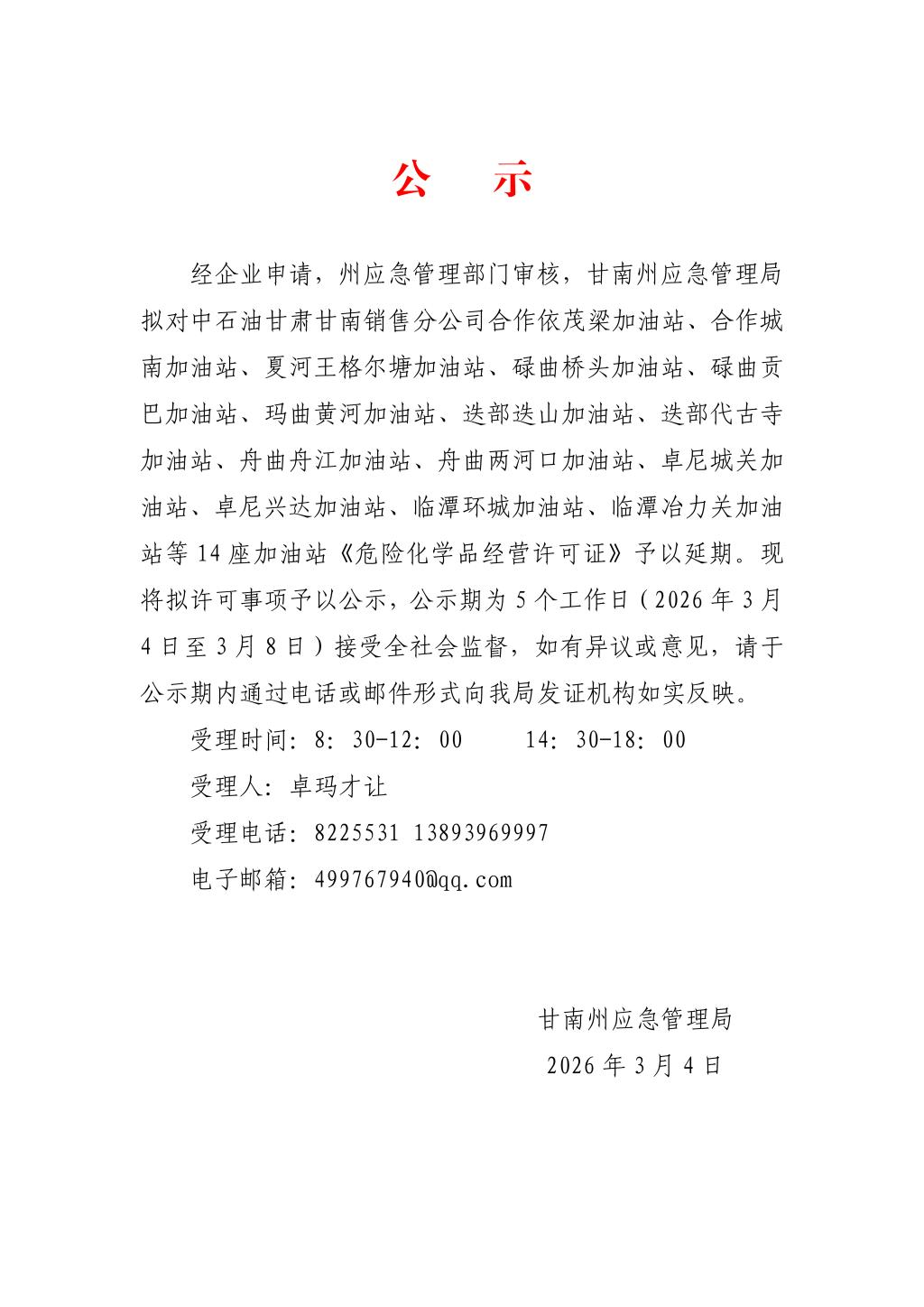 关于拟对中石油甘肃甘南销售分公司合作依茂梁加油站等14座加油站《危险化学品经营许可证》予以延期的公示