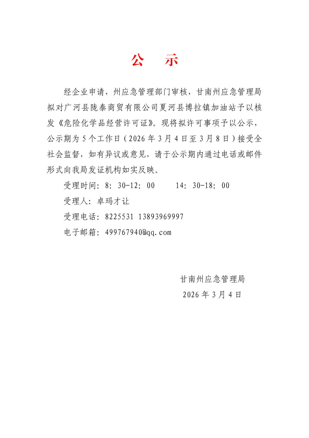 关于拟对广河县陇泰商贸有限公司夏河县博拉镇加油站予以核发《危险化学品经营许可证》的公示