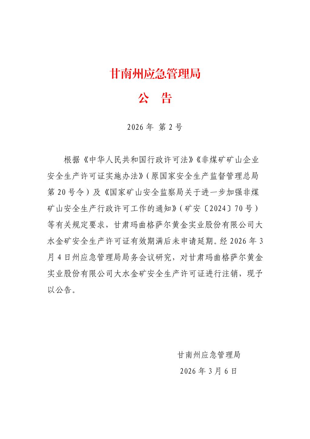 甘南州应急管理局公告 2026年第2号