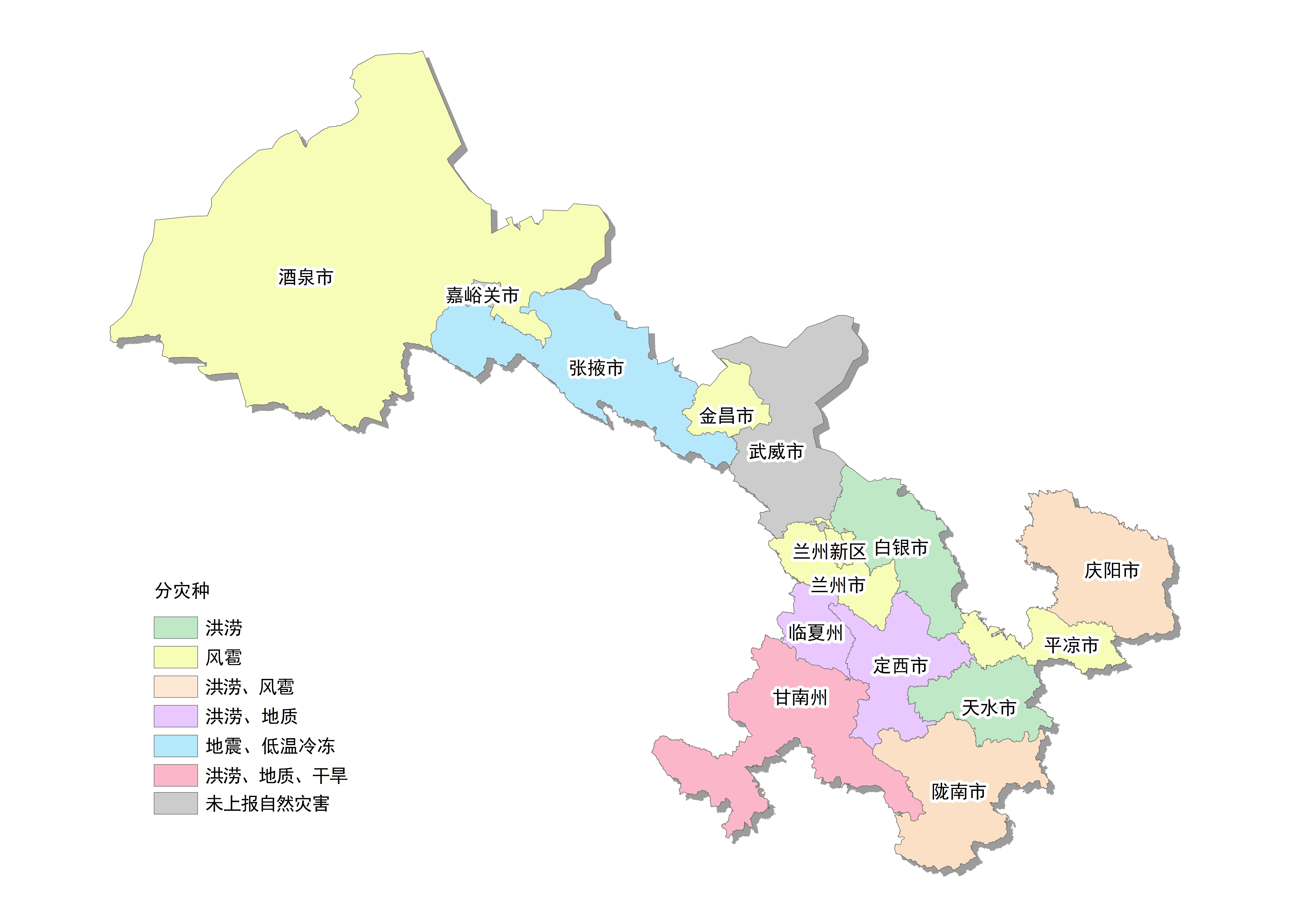 从灾害影响的市州来看,2014-2024年9月,全省12个市州和兰州新区均有自然灾害发生。其中,甘南主要受洪涝、地质和干旱3种自然灾害的影响,庆阳、陇南主要受洪涝和风雹2种自然灾害的影响,定西、临夏主要受洪涝和地质2种自然灾害的影响,张掖主要受地震和低温冷冻2种自然灾害的影响,白银、天水主要受洪涝灾害的影响,兰州、平凉、酒泉、金昌和兰州新区主要受风雹灾害的影响。具体空间分布见图1。